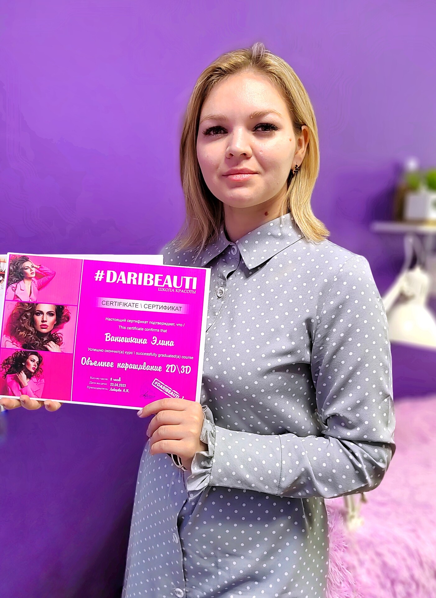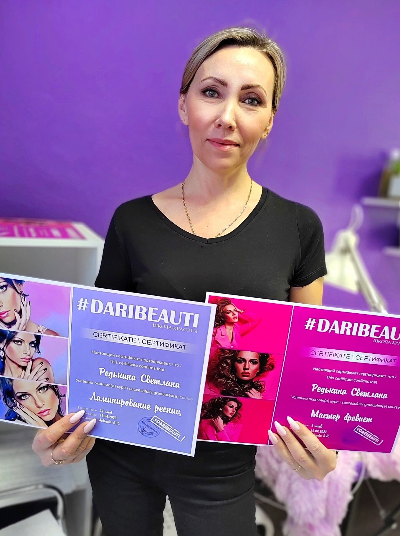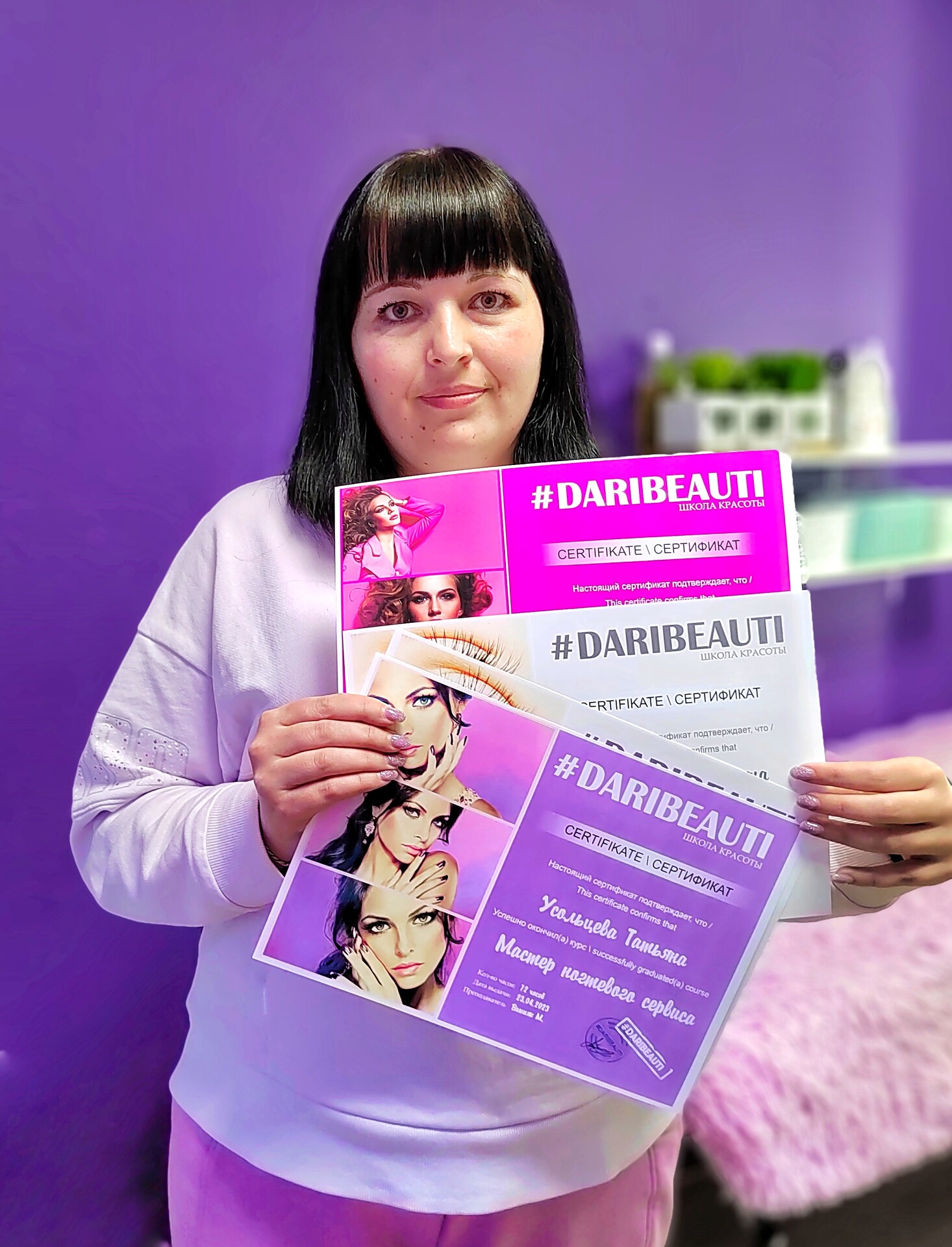 Хочу сказать слова благодарности школе красоты DARIBEAUTI, которая дала старт в новой интересной профессии. Отдельное спасибо преподавателю Алешиной Екатерине, за терпение и хорошее настроение на занятиях! !!