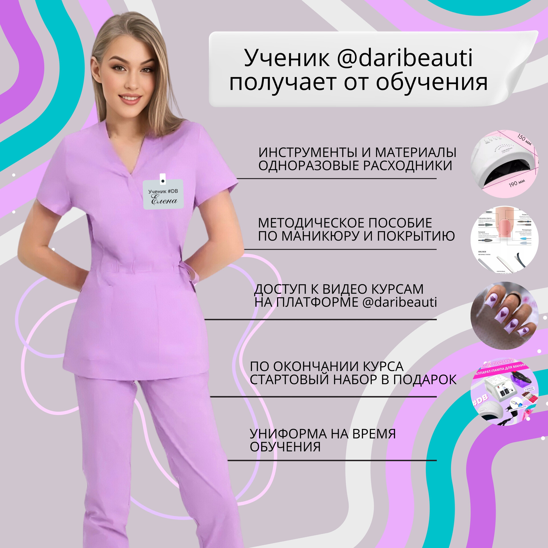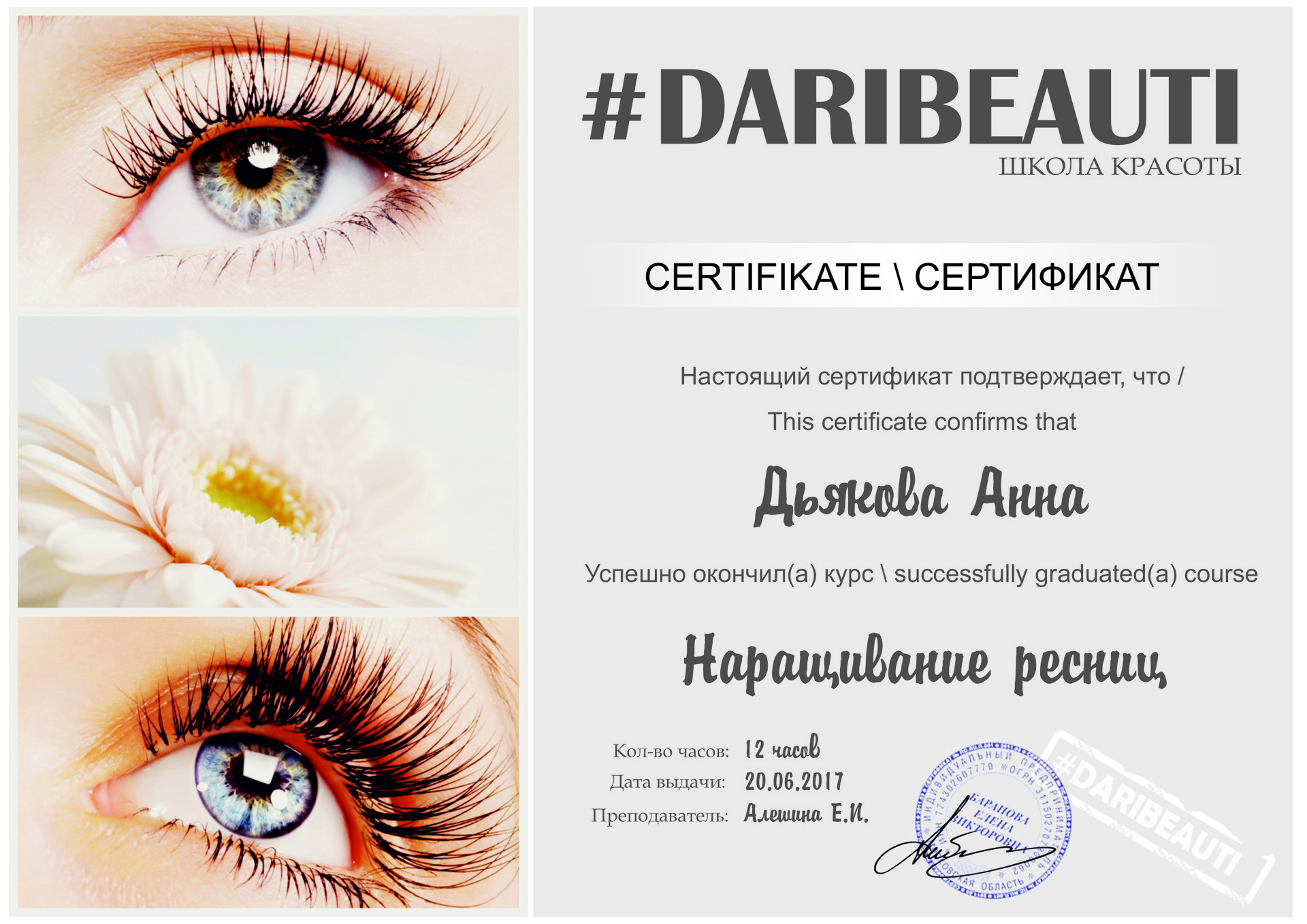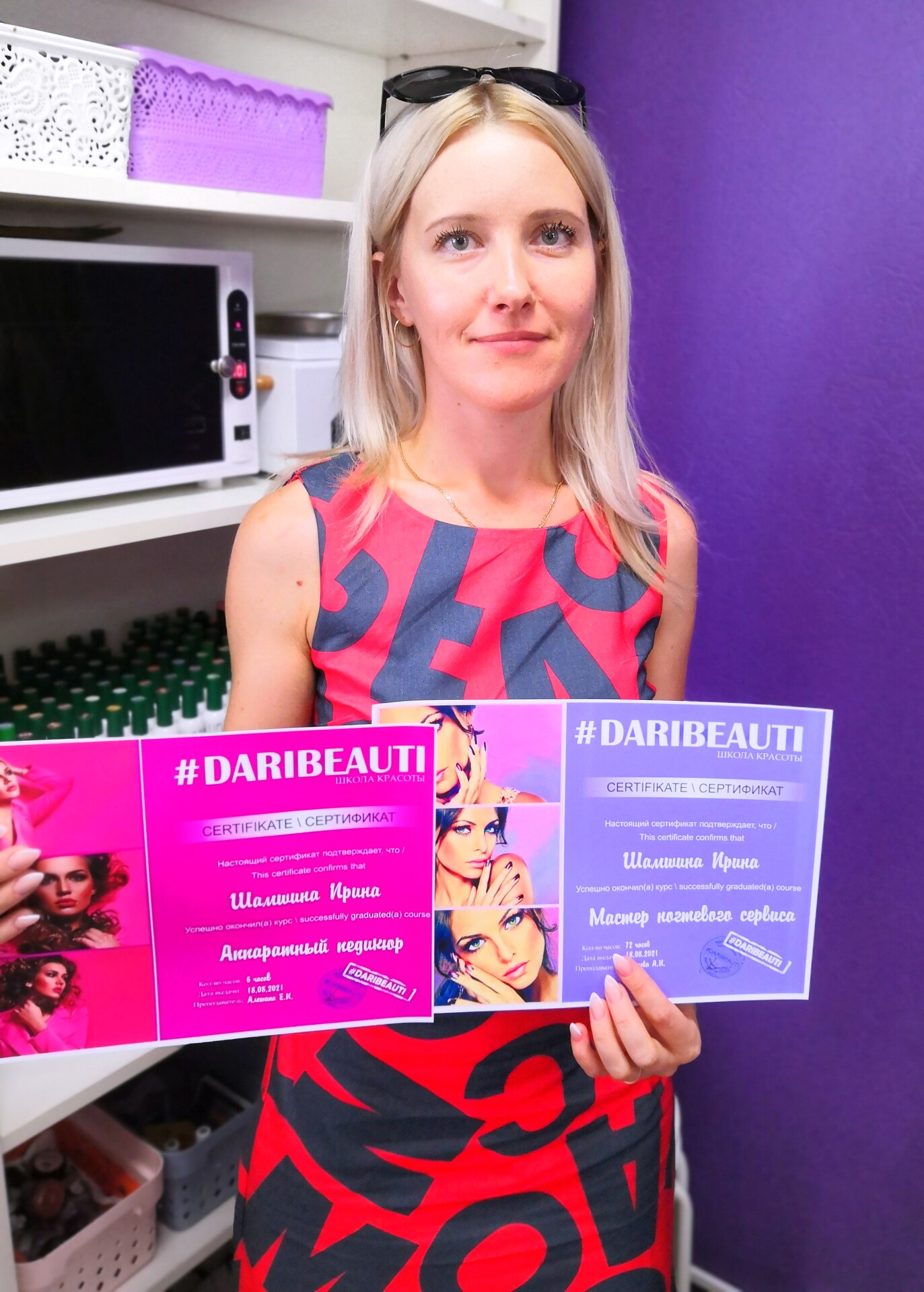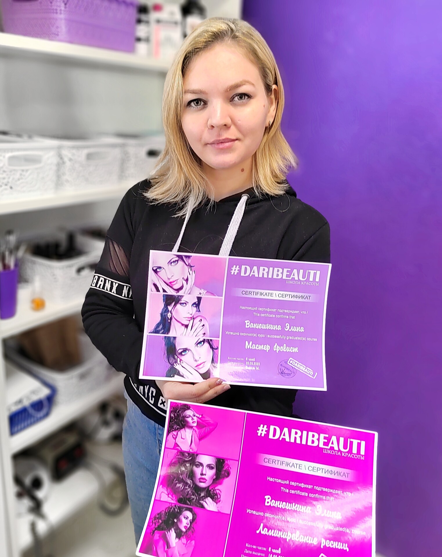 Хочу сказать слова благодарности школе красоты DARIBEAUTI, которая дала старт в новой интересной профессии. Отдельное спасибо преподавателю Алешиной Екатерине, за терпение и хорошее настроение на занятиях! !!